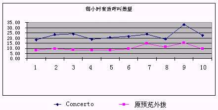 下圖可以看出使用原預(yù)覽外撥和采用Concerto預(yù)測外撥系統(tǒng)后單位座席每小時有效呼叫數(shù)量的比較: