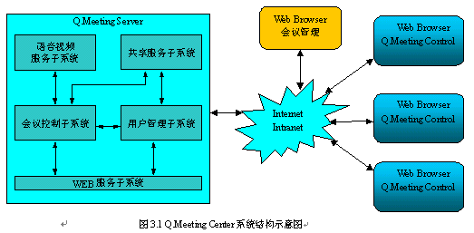 由于采用基于WEB的客戶端,Q.Meeting Center的部署是比較簡單的。只需按Q.Meeting Server的運行環(huán)境要求安裝配置好會議服務(wù)器即可。主持人和其他與會者使用普通PC機(jī)通過WEB瀏覽器訪問會議URL地址即可參加會議。