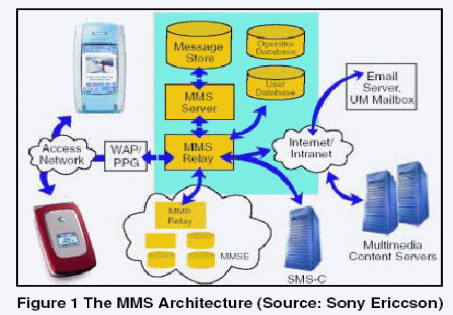 本概述提供了有關(guān)MMS標(biāo)準(zhǔn)的簡(jiǎn)要介紹,主要針對(duì)視頻內(nèi)容交換方面的內(nèi)容;镜腗MS網(wǎng)絡(luò)架構(gòu)如圖 1。