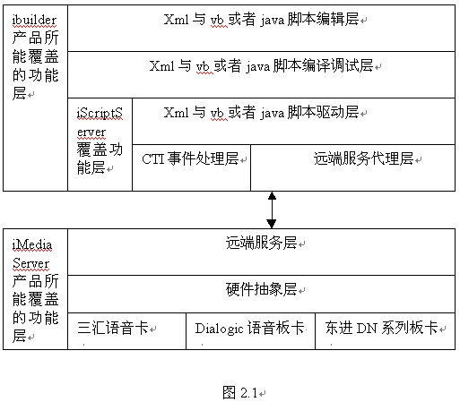 如圖2.1所述,ibuilder產品覆蓋了腳本編輯、編譯調試、腳本驅動、遠端服務代理的功能,占據了IVR業(yè)務系統(tǒng)重要的一部分。