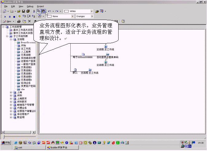 該產品通過將所有業(yè)務分別處于樹形化的節(jié)點上,可以直觀的對業(yè)務進行增加、刪除、修改的管理。增加子業(yè)務的時候,必須帶有業(yè)務類別,實現(xiàn)業(yè)務管理歸類化,避免業(yè)務管理的混亂。該產品還支持業(yè)務流程的樹形化表示,使業(yè)務流程開發(fā)者可以方便地了解業(yè)務流程的全局框架。