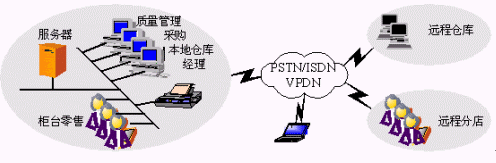 支持遠(yuǎn)程庫房、遠(yuǎn)程分店以及移動(dòng)辦公。網(wǎng)絡(luò)拓?fù)浣Y(jié)構(gòu)與連鎖經(jīng)營企業(yè)基本相同。
