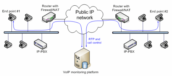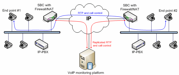 VoIP應用的質量監(jiān)控分為主動式和被動式兩種實現(xiàn)方式。主動式的系統(tǒng)能產生呼叫,而被動式的系統(tǒng)只是監(jiān)測進行中的呼叫。兩種方法各有優(yōu)勢。VoIP監(jiān)控方案的架構取決于網絡Edge設備的類型和結構。有些大型企業(yè)采用的VoIP網絡配備了一種特殊設備,叫SBC(Session boarder controller),除了完成類似路由器的功能外,還能完成流量分配、數(shù)據(jù)/語音信號加密以及業(yè)務質量控制等功能。此外,通過過濾和替換數(shù)據(jù)包內的、與用戶有關的特定信息,SBC還能隱藏公司的網絡拓撲結構和用戶信息,不被外部的IP世界所知道。