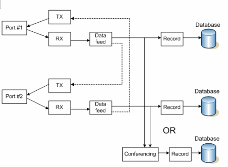 上圖中的媒體和控制數(shù)據(jù)流表示通過Prosody S (HMP) 或Prosody X板卡建立的兩個(或多個)端點之間的呼叫。媒體流(RTP)和信令信息都通過監(jiān)控平臺本身傳輸,高級的應用系統(tǒng)會記錄所有SIP/H.323事件和消息。傳真信息也可以存儲,保存在TiFF格式的圖形文件內。這里,系統(tǒng)可以在兩端分別錄制RTP流,也可以采用會議的方式錄制在一起。