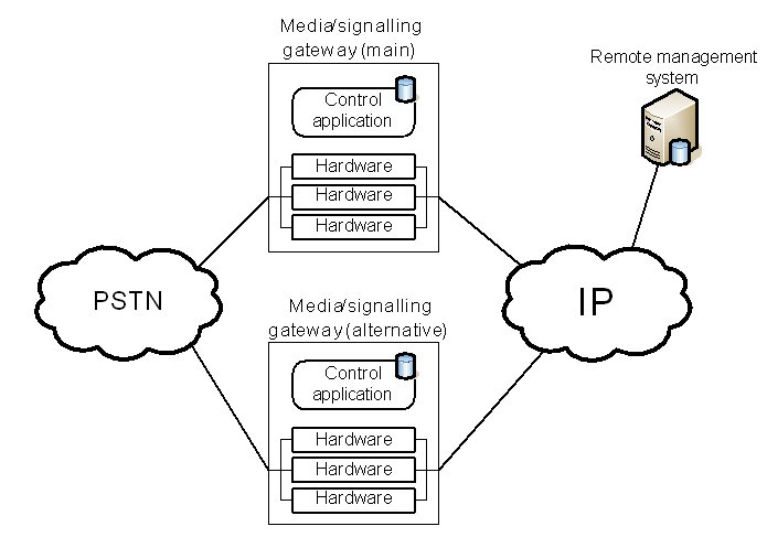 這兩種保護(hù)機制的區(qū)別可以從下面的例子進(jìn)一步闡述。該事例是一種企業(yè)IP-PSTN網(wǎng)關(guān)應(yīng)用。一般情況下,企業(yè)級的網(wǎng)關(guān)并不采用軟交換架構(gòu),所以媒體和信令網(wǎng)關(guān)功能在同一設(shè)備內(nèi)實現(xiàn)。這類網(wǎng)關(guān)是一個獨立的機架,內(nèi)裝能實現(xiàn)媒體和信令處理的硬件板卡和控制類應(yīng)用程序。此設(shè)備可以本地管理,也可以采用遠(yuǎn)程管理,如采用標(biāo)準(zhǔn)Web服務(wù)器。