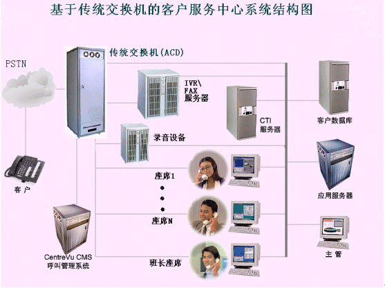 在以往大型CTI系統(tǒng)的設(shè)計(jì)中,這種模式是最常用的解決方案。傳統(tǒng)交換機(jī)由于其電信級(jí)標(biāo)準(zhǔn)的設(shè)計(jì),接入容量大、交換處理能力強(qiáng)、性能穩(wěn)定,因而往往被大、中型呼叫中心用在前端構(gòu)成ACD系統(tǒng)(自動(dòng)呼叫分配系統(tǒng))用來處理排隊(duì)、路由管理、坐席管理等功能。