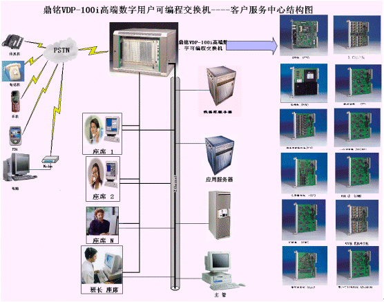 接入平臺(tái)實(shí)現(xiàn)外界接入的控制和話務(wù)交換、資源的合理分配,是構(gòu)建呼叫中心的成功關(guān)鍵所在。DM大型呼叫中心系統(tǒng)接入平臺(tái)采用鼎銘VDP-100i高端數(shù)字可編程交換機(jī),該交換機(jī)所有資源板卡都采用了高集成度、功能模塊設(shè)計(jì)思想。該接入平臺(tái)的結(jié)構(gòu)如上圖所示的右邊(詳細(xì)的功能模塊資源板請(qǐng)參閱《鼎銘高端數(shù)字可編程交換機(jī)產(chǎn)品手冊》),用戶可以根據(jù)實(shí)際情況靈活配置和增減系統(tǒng)的接入方式、資源類型、資源數(shù)量,達(dá)到資源的充分合理利用的目的。