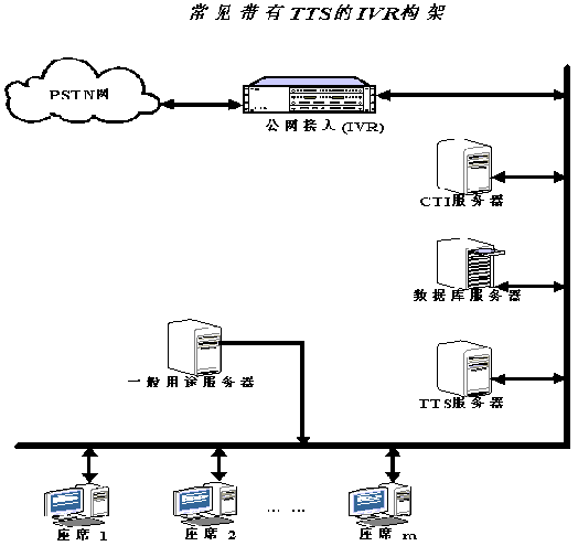 在一般的CTI應用系統(tǒng)中,都會有IVR(交互式語音應答系統(tǒng))。IVR系統(tǒng)是呼叫中心的重要組成部分,通過IVR系統(tǒng),用戶可以利用音頻按健電話輸入信息,從系統(tǒng)中獲得預先錄制的數(shù)字或合成語音信息。具有TTS功能的IVR可以加快服務速度,節(jié)約服務成本,使IVR為呼叫者提供7*24小時的服務。