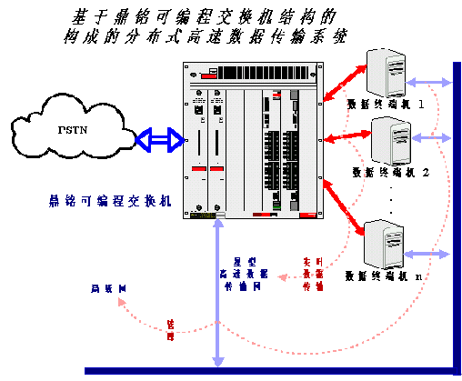 鼎銘高速數(shù)據(jù)傳輸板置于其可編程交換機內(nèi),外部可以和多臺PC或工控機相連,因為可編程交換機可以級聯(lián),所以可以和外部連接的PC或工控機理論上沒有特別限制。這樣可編程交換機的內(nèi)部I/O總線(類比于PC機的PCI或ISA總線)就不再傳輸實時數(shù)據(jù)(如語音數(shù)據(jù)),而只負責非實時性的管理和信令數(shù)據(jù),語音或其它實時數(shù)據(jù)從外部PC直接傳入可編程交換機的高速數(shù)據(jù)傳輸板,然后通過交換直接進入外部公共電信網(wǎng)(PSTN)。