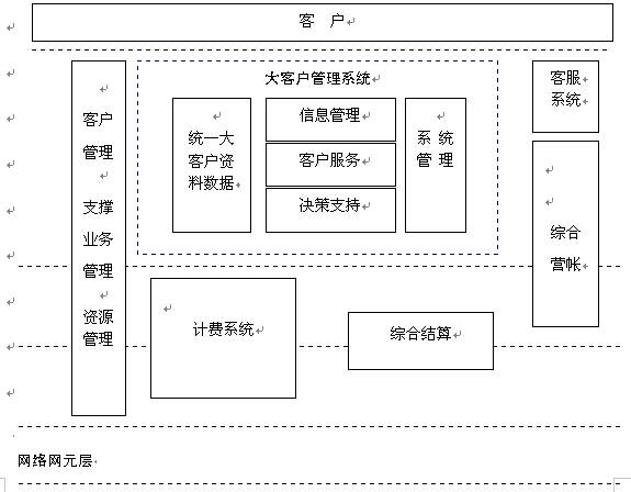電信大客戶管理系統(tǒng)是在收集大客戶市場調(diào)查信息、大客戶資料信息、大客戶經(jīng)營戰(zhàn)略資源的基礎(chǔ)上,自動采集專業(yè)計費、綜合營帳、客服、網(wǎng)管、財務(wù)等系統(tǒng)的相關(guān)數(shù)據(jù),實現(xiàn)快速、全面、準(zhǔn)確的新客戶業(yè)務(wù)受理、新增需求受理及故障處理過程通道,實現(xiàn)完善的客戶經(jīng)理管理、代理商管理系統(tǒng),最終實現(xiàn)完整的大客戶滿意度評估體系和針對大客戶的個性化服務(wù)。建成后的系統(tǒng)從管理、服務(wù)、分析三方面出發(fā)主要應(yīng)具備信息管理、客戶服務(wù)、決策支持功能。