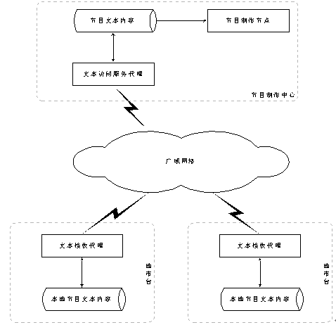 單一的節(jié)目制作中心一般放置在省中心。在節(jié)目制作中心,節(jié)目數(shù)據(jù)以數(shù)據(jù)庫或者文本文件的方式存放于節(jié)目數(shù)據(jù)倉庫中。在節(jié)目制作中心運行文本訪問服務代理,接受各地市臺的數(shù)據(jù)請求并發(fā)送相應的數(shù)據(jù)。各個地市臺通過文本請求、接收代理向中心請求或者接收文本數(shù)據(jù),存放于本地數(shù)據(jù)倉庫,等待語音合成服務器合成成語音文件,地市臺使用合成后的語音文件迅速開通相應的節(jié)目。