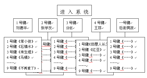 眾所周知,目前大多數(shù)電話機(jī)和手機(jī)的操作鍵盤都只有0-9十個(gè)數(shù)字鍵和*號(hào)和#號(hào)兩個(gè)符號(hào)鍵,因此在設(shè)計(jì)導(dǎo)航菜單的時(shí)候很受限制。比如在點(diǎn)歌節(jié)目中,用這些數(shù)字鍵來指代上千首歌曲是根本不可能的。以前多采用的方法有兩種:一是預(yù)先給用戶發(fā)送歌曲手冊(cè),上面可以查到每首歌曲的代號(hào)。這種方式的缺點(diǎn)是實(shí)時(shí)性差,不能隨時(shí)更新歌曲庫(kù)。另外印刷宣傳資料帶來的人力和成本也不容忽視;另一種方法是將歌曲根據(jù)歌手、主題進(jìn)行分類,比如下圖所列的結(jié)構(gòu):