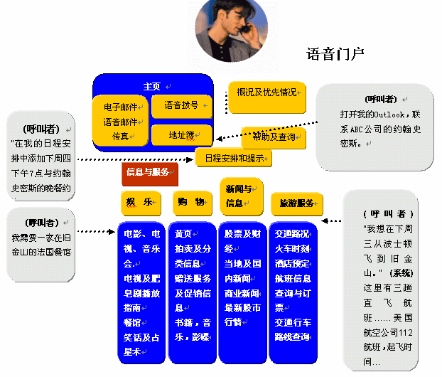 基于在語音識(shí)別技術(shù)準(zhǔn)確度上已有突破性的進(jìn)展,因此可以利用語音,不僅僅是改變?cè)械逆I盤輸入查詢方式,而且能夠使自動(dòng)應(yīng)答系統(tǒng)處理更加復(fù)雜的情況。用戶撥打服務(wù)電話的時(shí)候,只需說出他/她的需求即可。如在電子黃頁(yè)業(yè)務(wù)中,用戶要查詢關(guān)于A公司的情況,服務(wù)電話接通以后就可以直接說出"A公司",而不要按鍵通過一層層的菜單目錄,然后系統(tǒng)就能自動(dòng)播報(bào)出該單位介紹信息和聯(lián)系方式等。