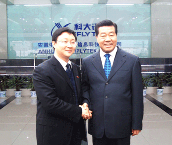 12月19日上午,中共中央政治局常委、全國政協(xié)主席賈慶林一行在安徽省委書記郭金龍、省長王金山等省市領(lǐng)導(dǎo)陪同下來到國家863計劃成果產(chǎn)業(yè)化基地——科大訊飛公司視察,賈慶林主席對科大訊飛在中文語音技術(shù)和產(chǎn)業(yè)化方面的成績給予充分肯定。上午8時30分,賈主席一行抵達(dá)訊飛語音產(chǎn)業(yè)大樓。中國科技大學(xué)黨委書記郭傳杰、科大訊飛總裁劉慶峰博士、基地總工陳濤及基地工作人員熱烈歡迎賈主席的到來。