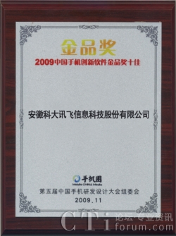 科大訊飛獲“2009中國手機創(chuàng)新軟件金品獎十佳”企業(yè)