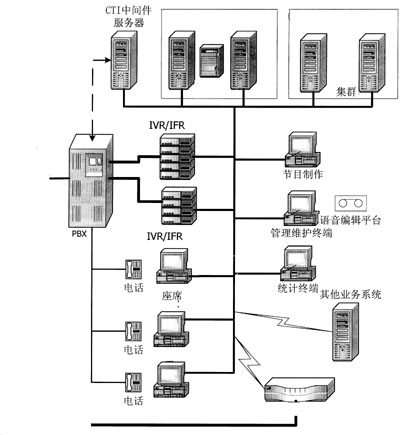 CTI Server/ACD Server 兩臺基于Intel 架構(gòu)的高端服務器安裝Turbolinux Server后,利用Turbolinux Cluster Server組成呼叫中心平臺控制系統(tǒng)的集群服務器,并運行呼叫中心CTI和ACD服務程序。