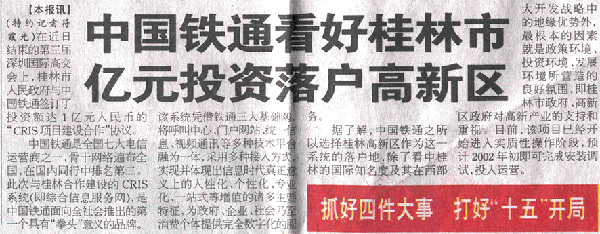 10月13日,鐵通網(wǎng)絡(luò)技術(shù)有限公司與桂林市政府在深圳高交會(huì)上隆重舉辦了《CRIS項(xiàng)目建設(shè)合作協(xié)議書(shū)》簽約儀式。廣西區(qū)政府副主席吳恒、桂林市副市長(zhǎng)孫中文、鐵通公司總經(jīng)理彭朋、鐵通全市場(chǎng)總監(jiān)劉德全、鐵通網(wǎng)絡(luò)技術(shù)公司總經(jīng)理李奇才、副總裁栗嵐以及CRIS項(xiàng)目的總集成商北京佳訊飛鴻信息技術(shù)有限公司董事長(zhǎng)王翊、執(zhí)行副總裁黃煒、CRIS項(xiàng)目業(yè)務(wù)桂林代理商訊聯(lián)科技有限公司總經(jīng)理呂振華等領(lǐng)導(dǎo)都參加了這次具有歷史使命意義的簽約儀式。