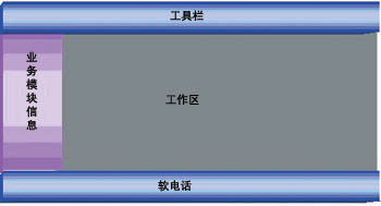 軟電話提供標(biāo)準(zhǔn)的呼叫控制功能,如座席的登錄、注銷等。業(yè)務(wù)模塊信息根據(jù)該座席的技能設(shè)置顯示該座席能夠使用的座席業(yè)務(wù)模塊,工作區(qū)是座席使用業(yè)務(wù)模塊的區(qū)域,業(yè)務(wù)模塊的調(diào)入可以是系統(tǒng)根據(jù)自動服務(wù)傳遞的參數(shù)自動彈出,也可以是座席人員手工選擇相應(yīng)的業(yè)務(wù)操作。同時,業(yè)務(wù)模塊通過標(biāo)準(zhǔn)的接口和軟電話模塊進(jìn)行通信,取得或者設(shè)置系統(tǒng)的呼叫參數(shù)或操作,包括提取系統(tǒng)主被叫號碼、用戶按鍵等。通過工具欄提供系統(tǒng)的菜單、快捷鍵、快捷按鈕的使用。通過這種方式,系統(tǒng)可以隨時增加、修改座席的業(yè)務(wù)模塊,而無須修改整個座席端,有利于系統(tǒng)業(yè)務(wù)的分步實(shí)施,大大縮短了系統(tǒng)的整個建設(shè)周期。