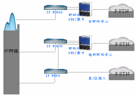 利用IP MUX系列網(wǎng)關(guān)可以把多個呼叫中心通過IP網(wǎng)絡(luò)匯接,中心的交換機負(fù)責(zé)所有呼叫的建立、釋放、應(yīng)答和路由控制,并負(fù)責(zé)呼叫ID的產(chǎn)生和傳送。