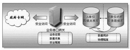 業(yè)務(wù)接入網(wǎng)關(guān)放置在每一個接入到本系統(tǒng)的部門或單位內(nèi),具有快速方便的異構(gòu)數(shù)據(jù)庫的連接能力,它主要完成兩個方面的功能,一方面實現(xiàn)本部門共享信息的對外發(fā)布,另一方面也通過核心的信息交換機(jī)實現(xiàn)其它相關(guān)部門的共享信息的采集工作。業(yè)務(wù)接口網(wǎng)關(guān)具有兩個網(wǎng)絡(luò)接口,一端連接本單位的內(nèi)部網(wǎng)絡(luò),另一端接入政府專網(wǎng)中。