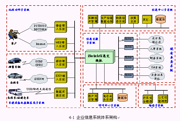 本項目中的企業(yè)信息系統(tǒng)由中心系統(tǒng)、場站系統(tǒng)、車載設備及數(shù)據(jù)采集系統(tǒng)和遠程訪問系統(tǒng)組成,其中中心系統(tǒng)包括信息中心、呼叫中心、信息交換系統(tǒng)。項目實施過程中采用了黎明網(wǎng)絡自主知識產(chǎn)權的iSwitch信息交換機,系統(tǒng)邏輯結構如下圖所示:
