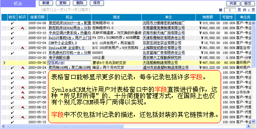 上圖"機會管理"表格窗口進一步對人本化的管理方法進行了舉例。在這里,您可直接對瀏覽到的字段進行交互(是否能夠新建、修改、刪除,受管理授權或默認授權約束),而不必一定要轉到另外的窗口才可操作字段。該方法在SynleadCRM中處處存在,它不僅僅為了提高工作效率,更讓企業(yè)在推行CRM管理變革時襯托出靈活性,而不是帶來了僵化。