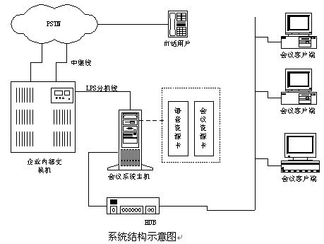 說明:如果沒有企業(yè)內(nèi)部程控交換機則可以將中繼線直接接在會議系統(tǒng)主機上,中繼線可以是普通模擬中繼,也可以是E1接口(如中國一號信令、30B+D等)。在與會議系統(tǒng)主機的同一網(wǎng)段上可以配置多個會議客戶端系統(tǒng),通過客戶端系統(tǒng)用戶可以隨時觀察和監(jiān)視會議系統(tǒng)的使用情況,并且可以建立常用用戶的用戶資料,也可以對常用用戶進行分組,這樣要呼叫某些用戶開會時只需呼叫組用戶即可;