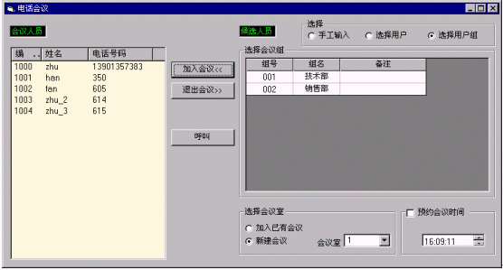 會議組織方通過客戶端查找到要參加會議的各方資料,建立會議,系統(tǒng)將自動呼叫這些電話,呼通后自動加入會議;