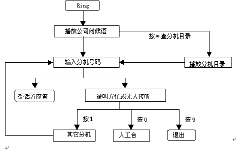 這種情況下自動(dòng)總機(jī)服務(wù)扮演了如同人工總機(jī)的角色,提示來(lái)話方鍵入分機(jī)號(hào)碼并將其轉(zhuǎn)接到指定的分機(jī)去。如果轉(zhuǎn)接不成功(被叫方占線,無(wú)人接聽(tīng)等)系統(tǒng)提示主叫轉(zhuǎn)到其它分機(jī)或轉(zhuǎn)人工臺(tái)。