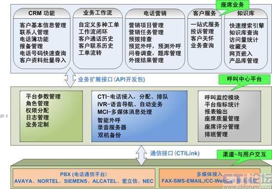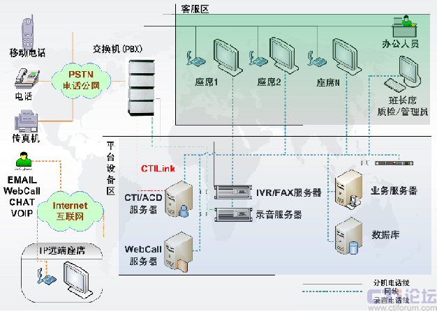呼叫中心通信平臺,包含了交換機(PBX)、CTI服務器、IVR服務器、傳真服務器、全程錄音設備等幾個部分,是客服中心實施的基礎。