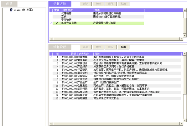 一套好的CRM軟件,應(yīng)當(dāng)同時支持多種銷售方法。例如,精密機械制造行業(yè),有可能同時需要支持四種銷售方法:標(biāo)準(zhǔn)整機銷售方法、項目型整機銷售方法、零件及有償服務(wù)銷售方法、三包件等。每個銷售方法都有對應(yīng)的銷售流程。以圖2為例,我們看到"機械設(shè)備直銷"的銷售方法,對應(yīng)著15個銷售階段,每個階段都可通過簡述來明確該階段典型的業(yè)務(wù)特征、成交可能性的區(qū)間,以便銷售代表在操作記錄的時候擁有共識。
