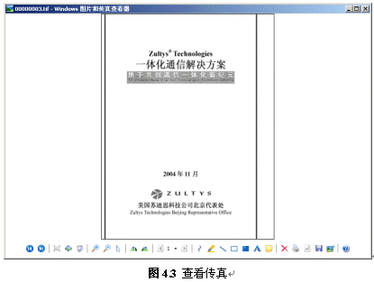 用戶可以顯示、保存、移動、刪除、復(fù)制傳真,也可以回?fù)軅髡鎭黼娞柎a。選擇顯示傳真時(shí),系統(tǒng)自動調(diào)用圖片處理軟件打開傳真(不同的操作系統(tǒng)軟件或版本所帶軟件不同,下圖僅供參考)。