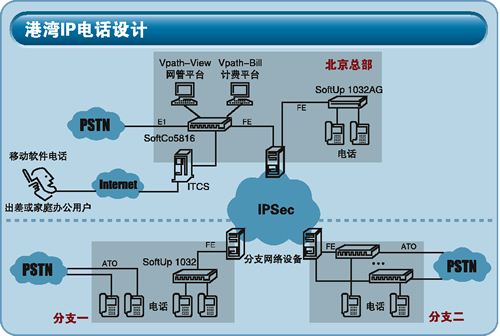 港灣網(wǎng)絡(luò)的IP電話系統(tǒng)是一個基于MGCP協(xié)議的IP電話系統(tǒng),由總部放置Softco5816語音交換機(jī)(主要功能是媒體網(wǎng)關(guān)控制器和部分媒體網(wǎng)關(guān)功能),用于接入用戶電話終端的Softup系列接入網(wǎng)關(guān)和軟電話系統(tǒng)(針對移動用戶和遠(yuǎn)程辦公用戶)構(gòu)成。提供了計費、管理軟件,以及基于軟件方式的話務(wù)臺。