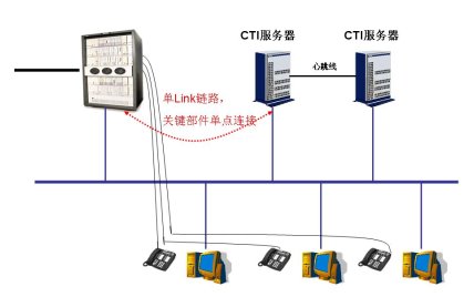 中汽網(wǎng)呼叫中心采用了Hi-Link產(chǎn)品的鏈路級雙機熱備解決方案,為核心部件CTI提供真正可靠的保障。以往的CTI產(chǎn)品在與PBX連接的時候,都是采用PBX廠家提供的“API層”接口,該接口只能部署到一臺服務(wù)器上,進(jìn)而也使得采用雙機熱備方案的CTI服務(wù)器存在單點故障,如圖所示: