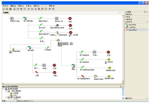 Hi-Link提供圖形化、流程式的ACD路由策略定制工具,實現(xiàn)ACD流程的靈活定義和配置。該工具不僅僅實現(xiàn)了流程邏輯、資源管理和數(shù)據(jù)庫訪問的可配置,而且可以在流程中內(nèi)嵌VBScript處理邏輯,進(jìn)而實現(xiàn)更加強大的路由管理能力。如圖所示: