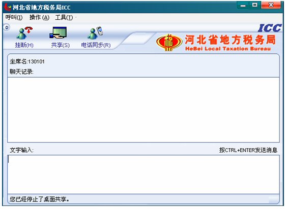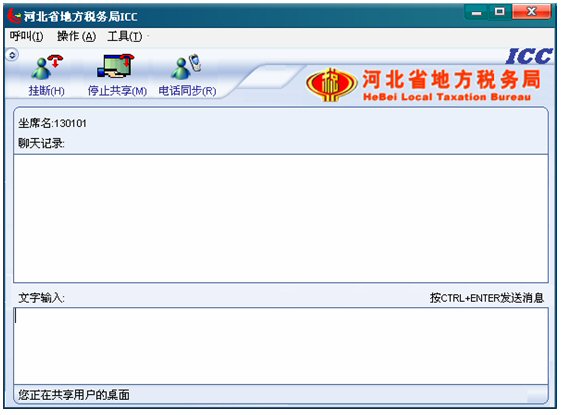 如有納稅人點擊共享按鈕,坐席的共享按鈕變?yōu)橥V构蚕戆粹o,并且左下角的狀態(tài)欄文字提示變?yōu)椤澳诠蚕碛脩舻淖烂妗保缦聢D: