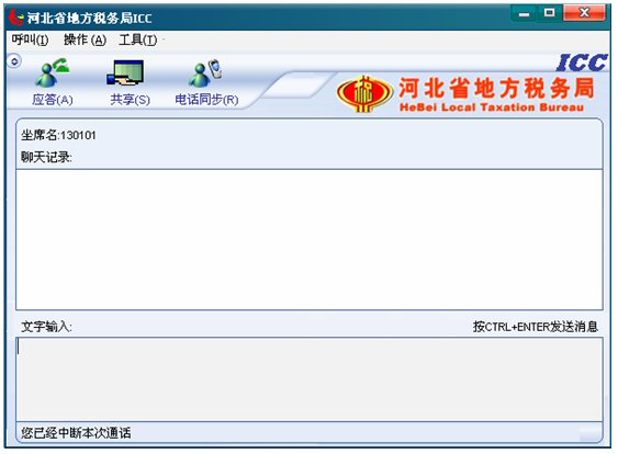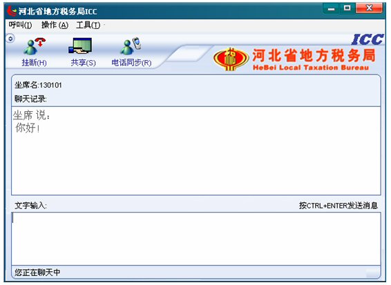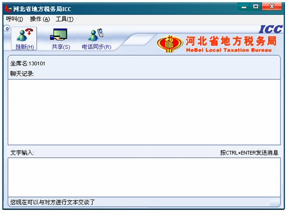 輸入文字信息后按CTRL+ENTER就可發(fā)送消息。輸入的文字可以在 ICC界面上面的聊天記錄對話框中顯示,同時發(fā)送給納稅人。如下圖: