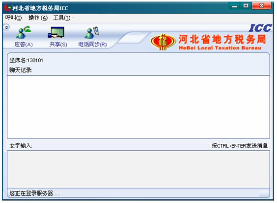 2. 點擊12366界面下面一行按鈕中的ICC按鈕,運行起來ICC。出現(xiàn)ICC界面,此時ICC處于登錄服務器狀態(tài),左下角的狀態(tài)欄有文字提示“您正在登錄服務器……”。聊天記錄對話框的上面有坐席名,例如“坐席名:130101”如下圖: