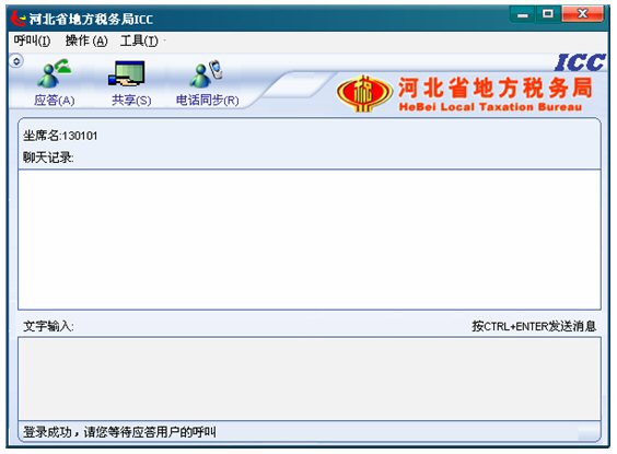 3. 稍等片刻,ICC登錄成功,此時坐席就可以等待納稅人的呼叫了,左下角狀態(tài)欄有文字提示“登錄成功,請等待應答用戶的呼叫”。如下圖: