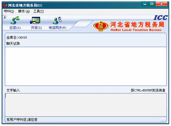 呼叫提示,如果坐席現(xiàn)在為全屏,有納稅人呼叫,ICC界面將會自動跳到全屏的前端。如果坐席現(xiàn)在不是全屏,有納稅人呼叫,任務欄里ICC對話框將自動閃爍。