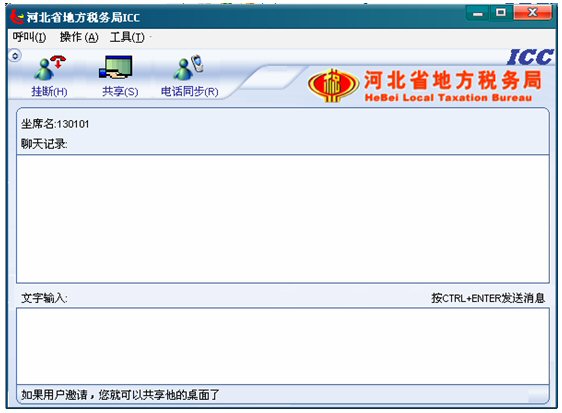收到納稅人共享請求提示,如果坐席現(xiàn)在為全屏,收到納稅人共享請求,ICC界面將會自動跳到全屏的前端,彈出共享框。如果坐席現(xiàn)在不是全屏,收到納稅人共享請求,任務欄里ICC對話框將自動閃爍,彈出共享框。