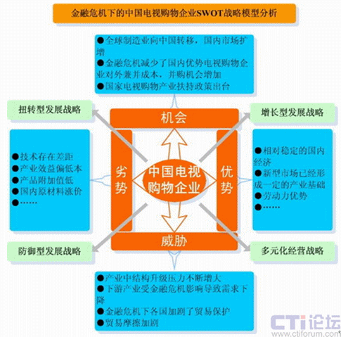 1992年至2009年以來,電視購物經歷了從割據(jù)到統(tǒng)一,全國購物頻道網(wǎng)絡化;從粗放到科學,頻道運營模式專業(yè)化;從簡介到深度,頻道編排方式規(guī)律化、從滯后到及時,物流配送體系成熟化。電視購物被譽為繼零售、超市之后的第三次銷售革命,電視購物將成為金融危機經濟形態(tài)下未來中國電視新的經濟增長點,而付費電視、數(shù)字網(wǎng)絡電視的發(fā)展,是中國電視購物市場新的戰(zhàn)略機會。金融危機下的中國電視購物企業(yè)SWOT戰(zhàn)略模型分析如下: