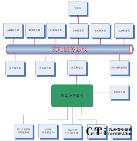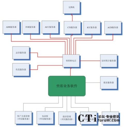 很多集成商或業(yè)務(wù)軟件開發(fā)商認(rèn)為這種結(jié)構(gòu)過于復(fù)雜,而他們自身往往提供“整體解決方案”,即所有的服務(wù)器軟件基本上都是自己的,根據(jù)客戶的要求修改即可。例如,客戶關(guān)系管理、知識(shí)庫、投訴管理、OA、訂單管理以及坐席軟電話、ADS服務(wù)器、IVR服務(wù)器、ACC服務(wù)器、ICC服務(wù)器、ACD服務(wù)器、錄音服務(wù)器、傳真服務(wù)器、報(bào)表服務(wù)器、實(shí)時(shí)統(tǒng)計(jì)服務(wù)器都是自己來做,那么對(duì)于很多接口環(huán)節(jié)都可以節(jié)省了。