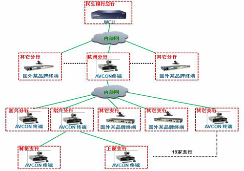 華平視頻會(huì)議系統(tǒng)應(yīng)用于民生銀行杭州分行以及下屬兩家三級(jí)分行和19家支行。其中杭州分行高清主會(huì)場(chǎng)采用AVCON CS2800全高清終端,融合高清視頻編解碼、寬頻語(yǔ)音等技術(shù),提供1080P全高清畫質(zhì)的交互體驗(yàn),實(shí)現(xiàn)與分行華平視頻終端以及其他品牌視頻終端的接入,從而實(shí)現(xiàn)總行、分行、支行的三級(jí)視頻會(huì)議。