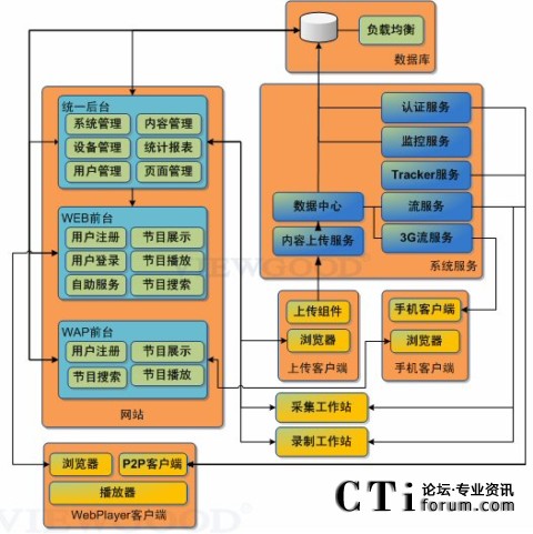 系統(tǒng)由“統(tǒng)一”管理后臺、Web前臺、WAP前臺、WebPlayer播放器、手機(jī)客戶端、采集工作站、錄制工作站、上傳客戶端、服務(wù)系統(tǒng)組成。之前已經(jīng)使用我們PC流媒體服務(wù)平臺的用戶,可以與手機(jī)流媒體系統(tǒng)合用一個后臺管理,實現(xiàn)了手機(jī)和PC平臺的統(tǒng)一后臺管理。