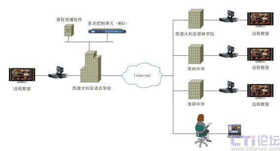中澳遠(yuǎn)程教育系統(tǒng)采用科達(dá)KDV8000C多點(diǎn)控制單元(MCU)1臺和課程錄播軟件1套安裝在西澳大利亞語言學(xué)院,4臺TS6610視頻會議終端,分別安裝在西澳語言學(xué)院、堪林學(xué)院、常州中學(xué)和淮陰中學(xué)的遠(yuǎn)程教室。此外,考慮到遠(yuǎn)程授課的實(shí)際應(yīng)用需求,系統(tǒng)還提供了無線麥克接入方案。系統(tǒng)部署拓?fù)鋱D見下圖。