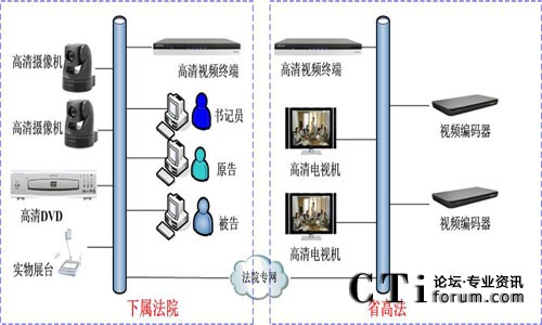 系統(tǒng)覆蓋省高院法庭、8個地市中院法庭和58個基層法庭。系統(tǒng)利用法院專用IP傳輸網(wǎng)絡(luò),以省高院各法庭為一級中心,地市中院為分控中心,基層法院為末端接入。在省高院中心、地市中院和基層分院設(shè)立遠(yuǎn)程數(shù)字庭審中心,配置庭審視頻終端、專用攝像機(jī)和麥克風(fēng),實(shí)現(xiàn)圖像傳輸和遠(yuǎn)程通信。