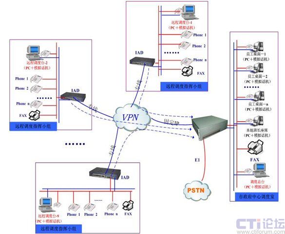 本次項目中,融天科技為大連市政府部署的防火調(diào)度指揮系統(tǒng)涉及點包括市政府中心調(diào)度室和分布在大連市各轄區(qū)的9個遠程指揮小組,中心調(diào)度室通過RT-CCP1000一體化調(diào)度平臺部署10個中心調(diào)度值班員,轄區(qū)的9個遠程指揮小組通過大容量IAD設(shè)備和政府VPN專網(wǎng)遠程注冊到中心調(diào)度室RT-CCP1000平臺上,同時RT-CCP1000平臺與本地的PSTN通過一條數(shù)字中繼E1連接,作為系統(tǒng)的出入口。如下圖所示: