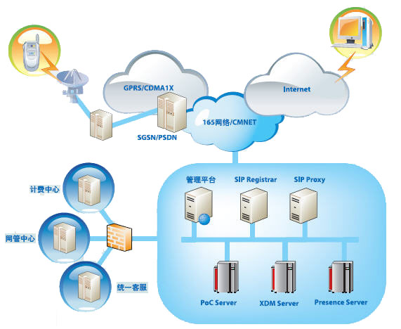 POC(Push-to-talk Over Cellular)是基于蜂窩移動(dòng)通信網(wǎng)絡(luò)的PTT(Push To Talk)業(yè)務(wù)。POC通過半雙工VoIP技術(shù)來實(shí)現(xiàn)PTT,利用GPRS或CDMA1X等網(wǎng)絡(luò)“永遠(yuǎn)在線”的優(yōu)勢(shì),節(jié)省運(yùn)營(yíng)成本,同時(shí)為傳統(tǒng)移動(dòng)用戶提供全新的業(yè)務(wù)形式。在支持GPRS/CDMA1X網(wǎng)絡(luò)的同時(shí),東信北郵手機(jī)一鍵通平臺(tái)系統(tǒng)亦支持IMS網(wǎng)絡(luò)。