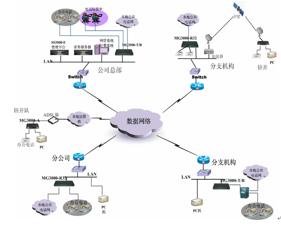 對規(guī)模比較小的辦事處,或者遠(yuǎn)端的鉆井隊(duì),一般在本地都是采用ADSL接入這樣方式,這樣情況可以直接配置MG3000-A語音往關(guān),實(shí)現(xiàn)語音數(shù)據(jù)同傳方式。MG3000-A提供1、4、8口多種方式供實(shí)際情況來選擇。所有的號碼可以直接在總部中心的平臺來分配控制。